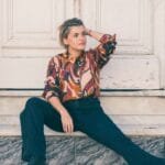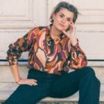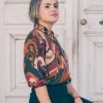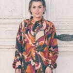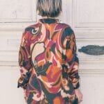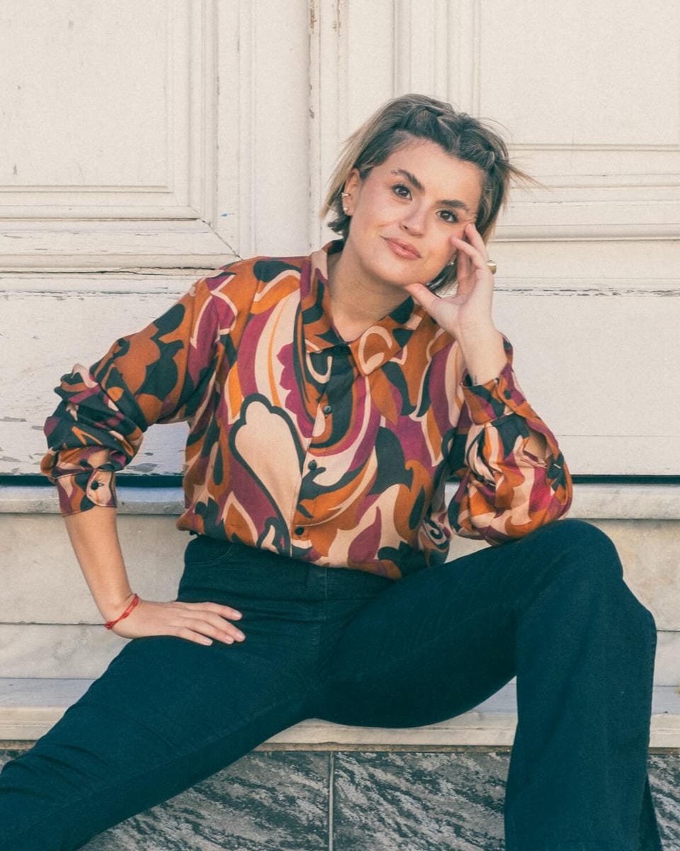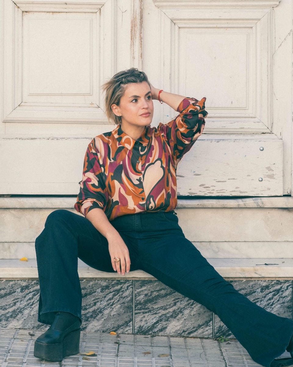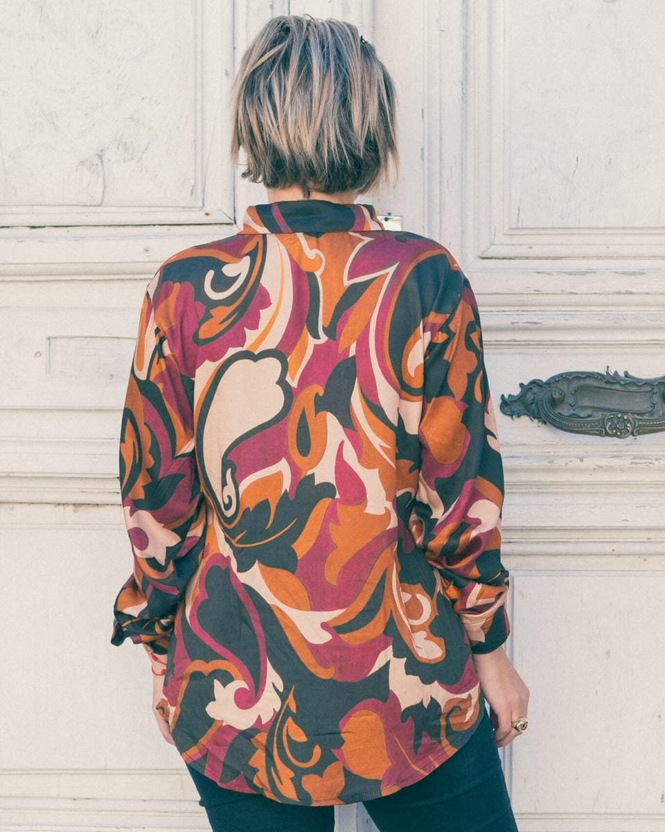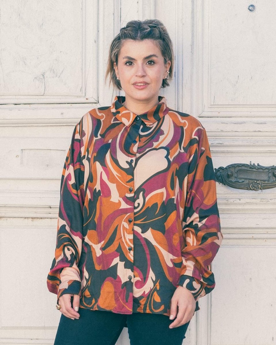 Camisas de manga larga en cuatro estampas distintas. Ésta es en fibrana estampada en arabescos retro