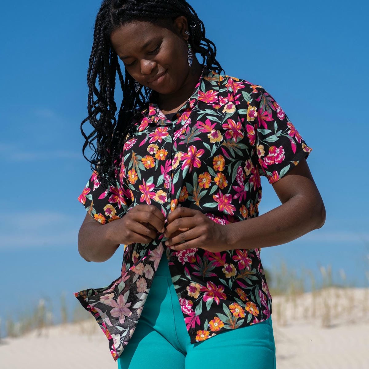 Camisa en fibrana estampada floral en tonos negro y fucsia. Corte oversize pero confeccionada en 5 talles.