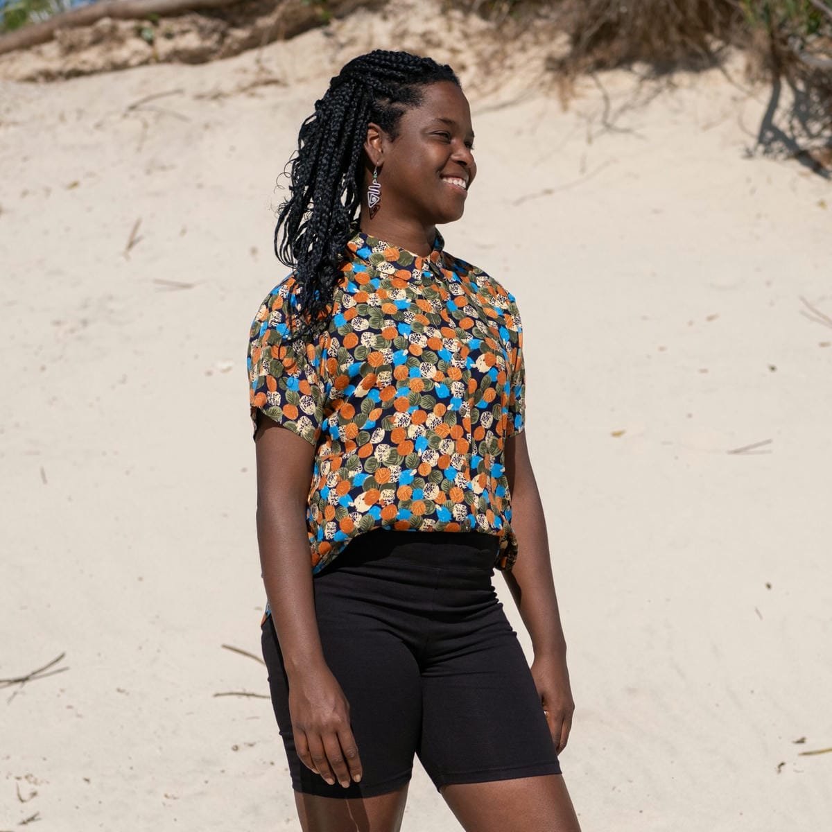 Camisa en fibrana estampada pompones retro. Corte oversize pero confeccionada en 5 talles.