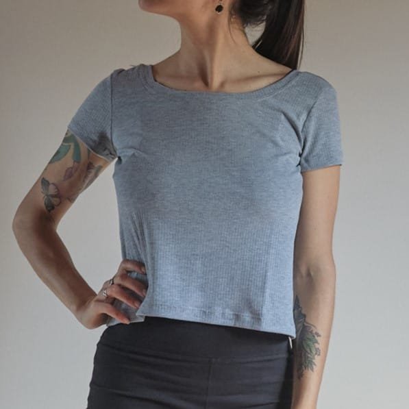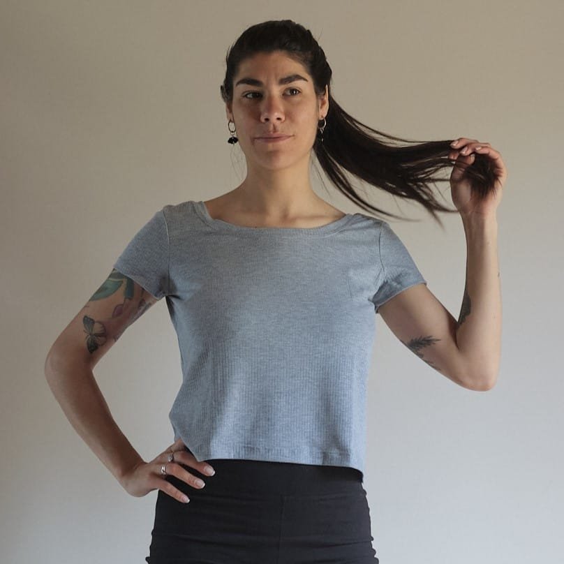 Remeras Alma en rib color gris claro, con espalda redonda pronunciada (mas escotada en la espalda que en el frente). Va re bien con jean, con short y con bikers.