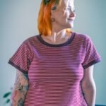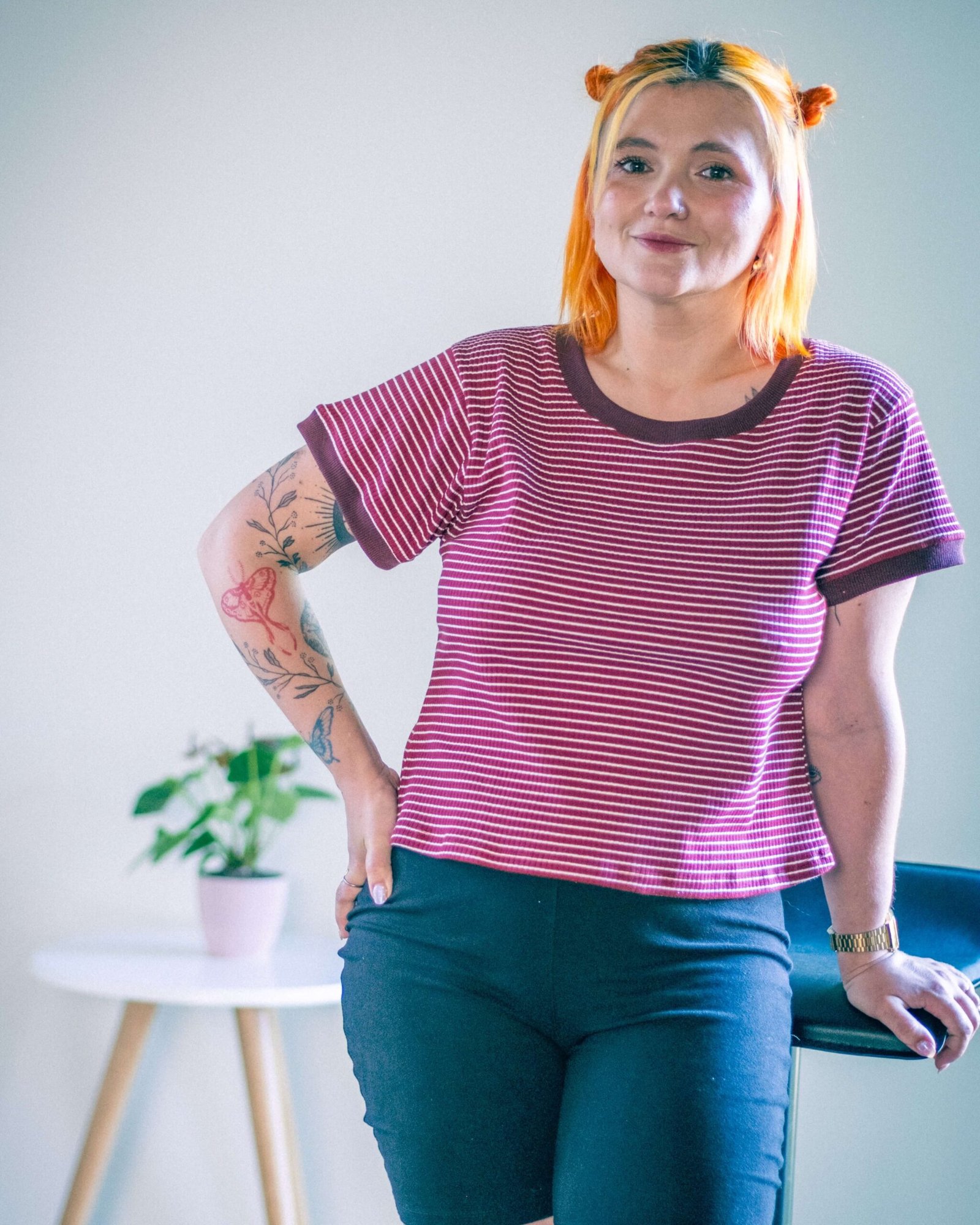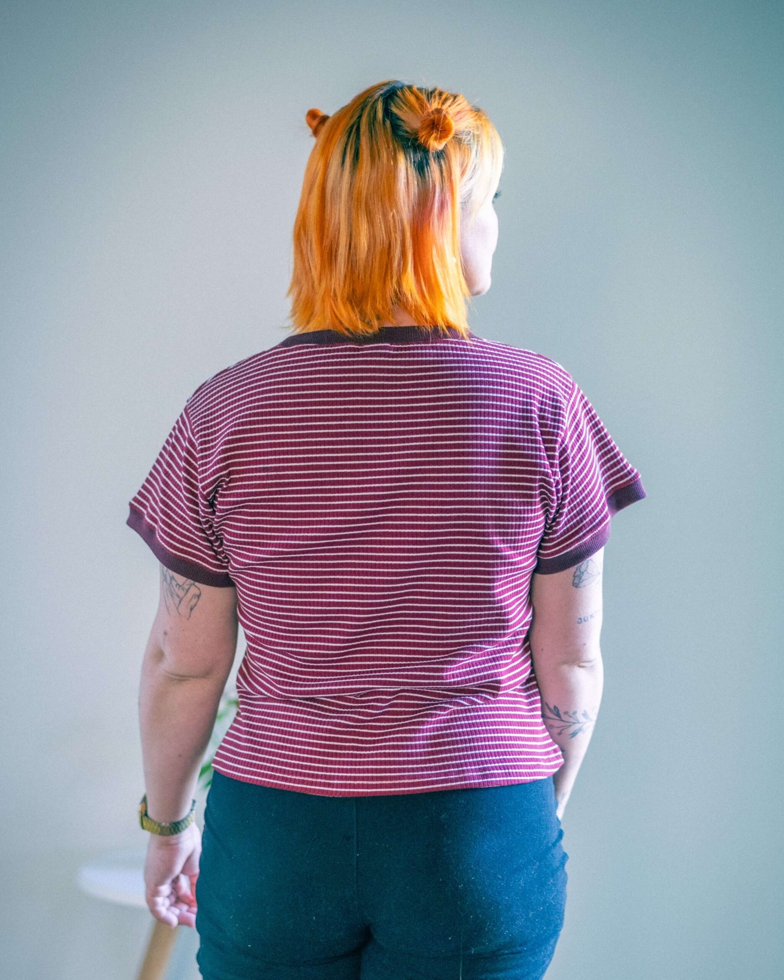 Nueva Remera Mar, disfrutá del calorcito con una reme hecha en rib rayado bordó y blanco, con puño en tono bordó.