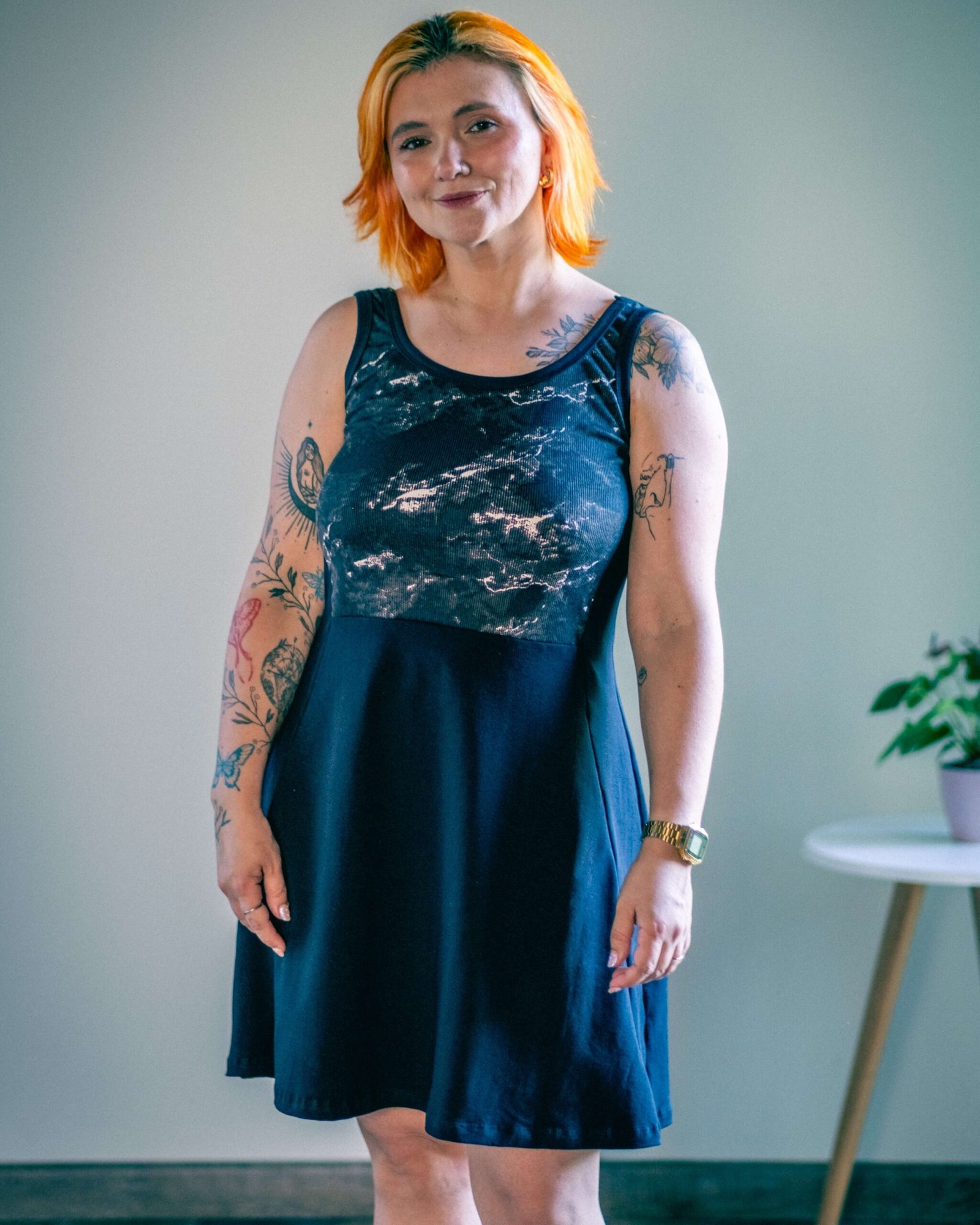 Vestido Relic en algodón elastizado combinado en negro liso y rib estampado a manchas negras. Andar cómoda, linda y fresquita!